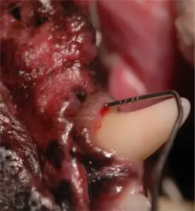 Deep pocket on the right maxillary canine tooth requiring open root planing and bone graft placement to stabilize this tooth