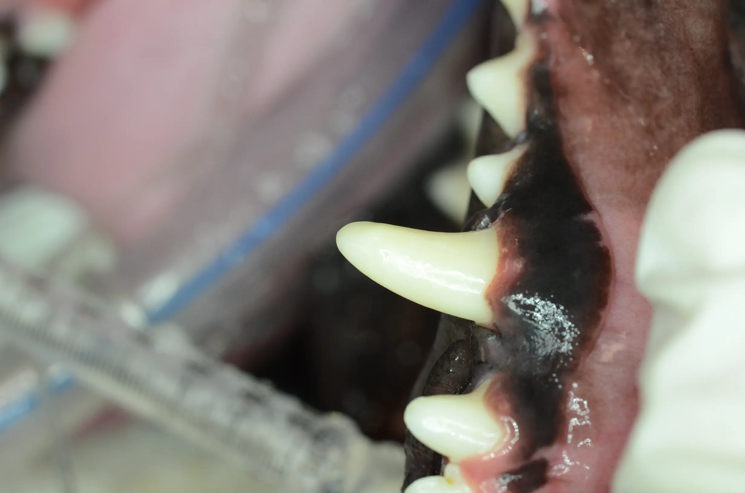 The image below is from a pet that broke the tip of his left maxillary canine tooth. Dentin is exposed. Broken or fractured teeth can become sensitive and cause the pet to possibly alter his chewing/playing habits. A very wise local veterinarian noticed this on an annual wellness exam and referred this pet for treatment.