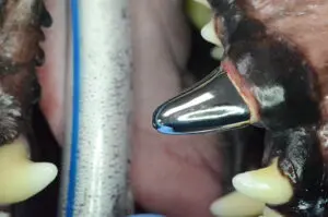 There are two treatment options for a non-vital tooth…root canal therapy or surgical extraction. Keeping an eye on it is NOT a viable option as your pet may be experiencing oral pain and discomfort. As the canines are the ‘hands’ of the pet, I recommend you attempt to save this tooth versus remove it. Root canal therapy is an excellent way to save a non-vital discolored tooth. We can even place a very strong full coverage crown over the tooth for added protection, that is done for many of our patients.