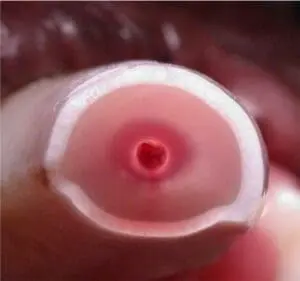 Redness around pulp cavity shows leaching of degrading red blood cells into the surrounding dentin. This causes the red hue of the tooth.