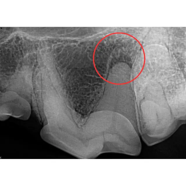 Radiograph of an uncomplicated crown fracture that has endodontic disease (see red circle). This tooth either requires root canal therapy or surgical extraction