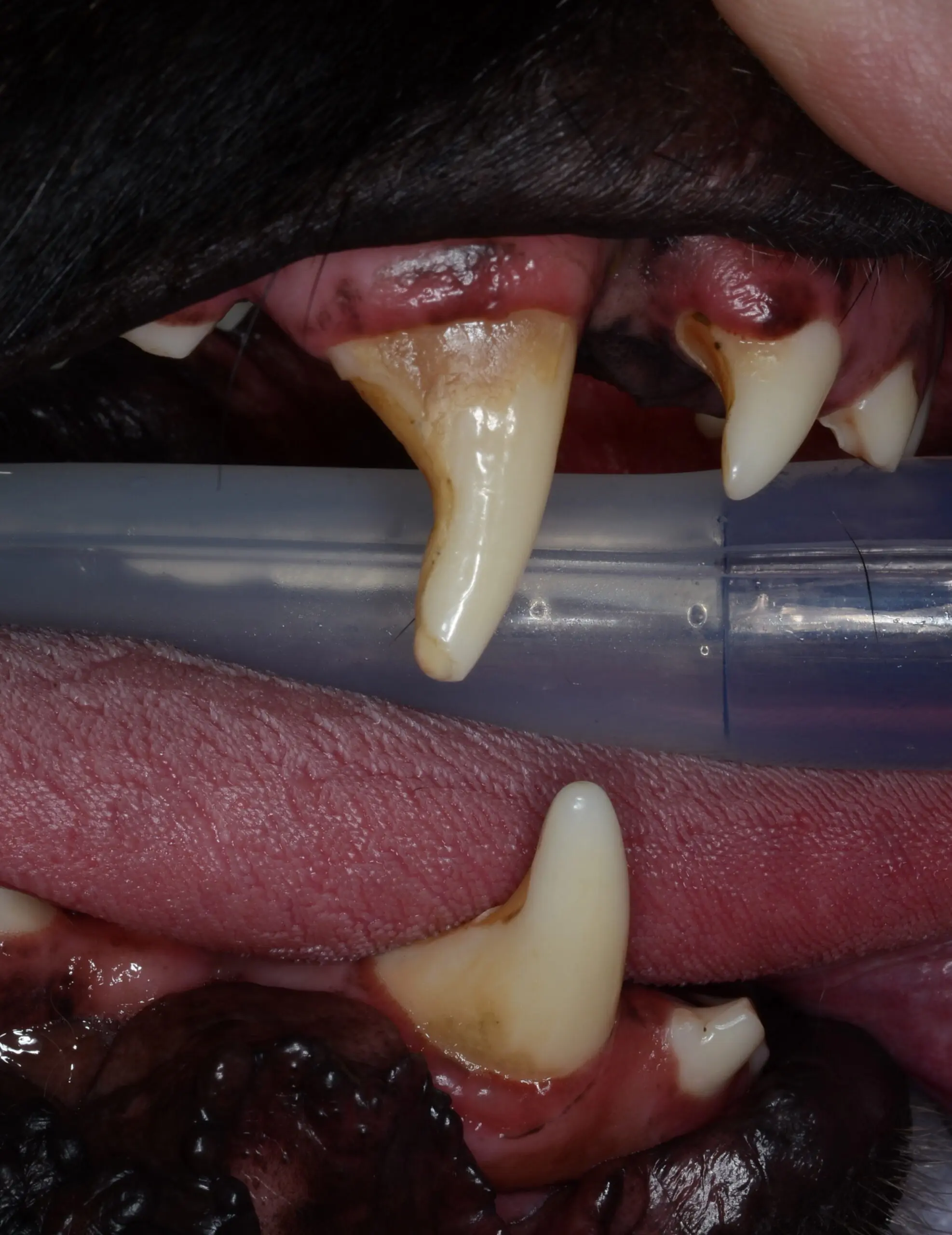 Abrasions on the distal (rear) part of the upper and lower canine teeth. This leads to extreme fatigue and possible tooth fracture (break) when stressed.